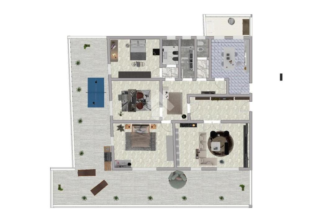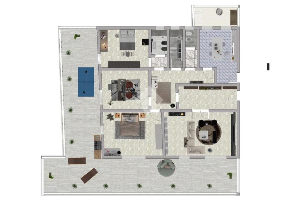 La zona notte è composta da tre camere da letto con uscita sul terrazzo e da doppi servizi, conferendo grande flessibilità agli ambienti. La proprietà dispone inoltre di un posto auto al piano seminterrato, accessibile tramite cancello elettrico e collegato direttamente allo stabile mediante ascensore, garantendo comodità e praticità negli spostamenti quotidiani.