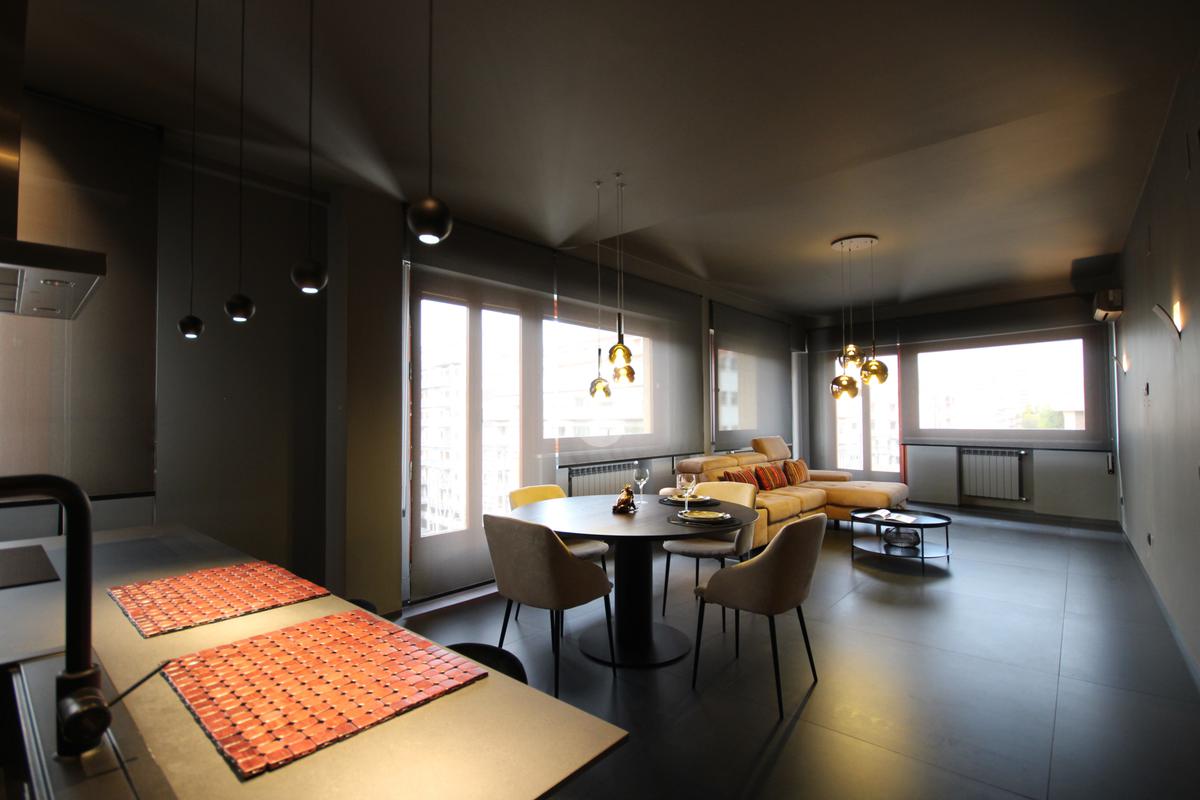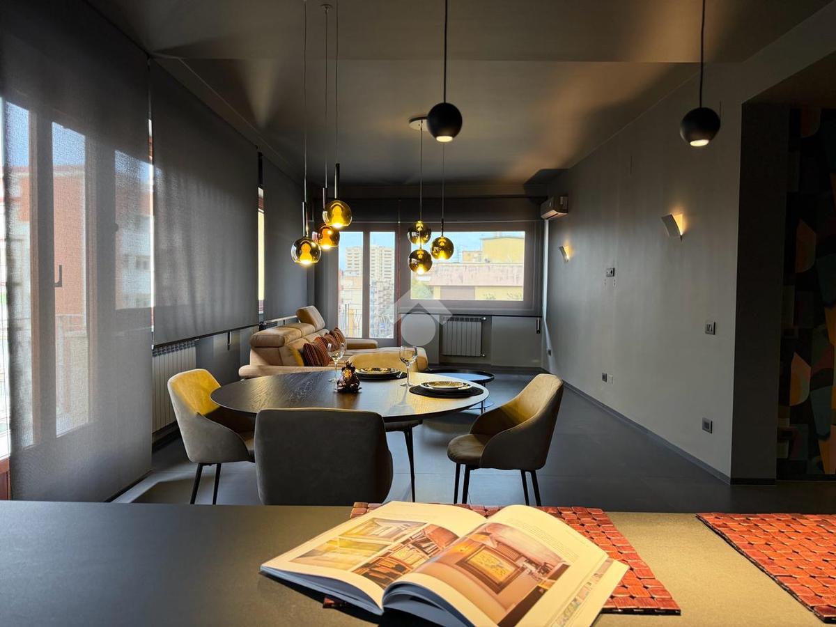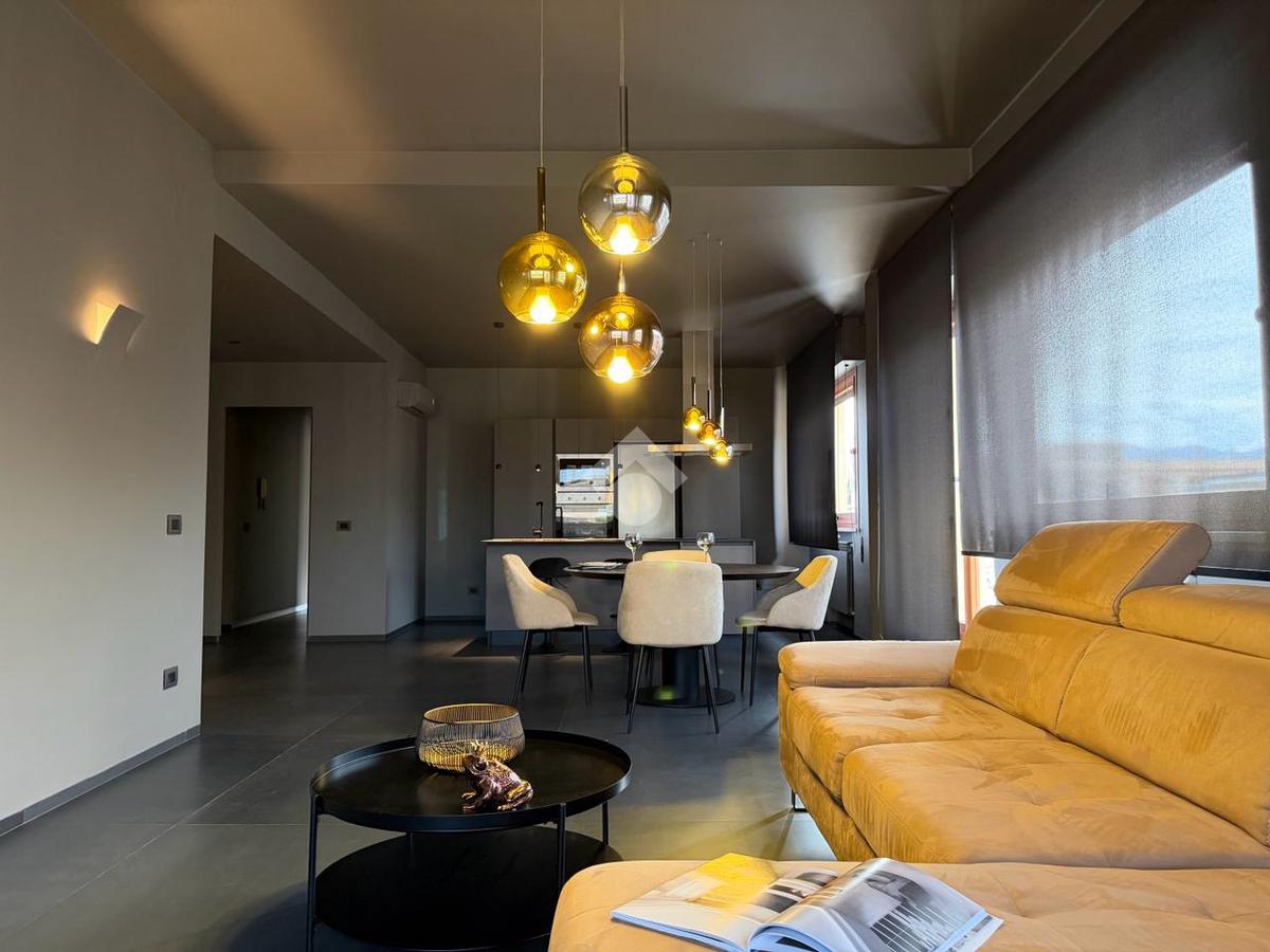 Posto al sesto piano, l’appartamento accoglie con un ampio living di rappresentanza con cucina a vista, dove design contemporaneo e materiali di pregio dialogano in perfetto equilibrio. Le raffinate tonalità del grigio, abbinate a una meticolosa cura dei dettagli e a finiture di alto livello, creano un ambiente elegante e luminoso, valorizzato da ampie superfici finestrate e balconi che offrono una suggestiva vista aperta sul quadrilatero del quartiere.