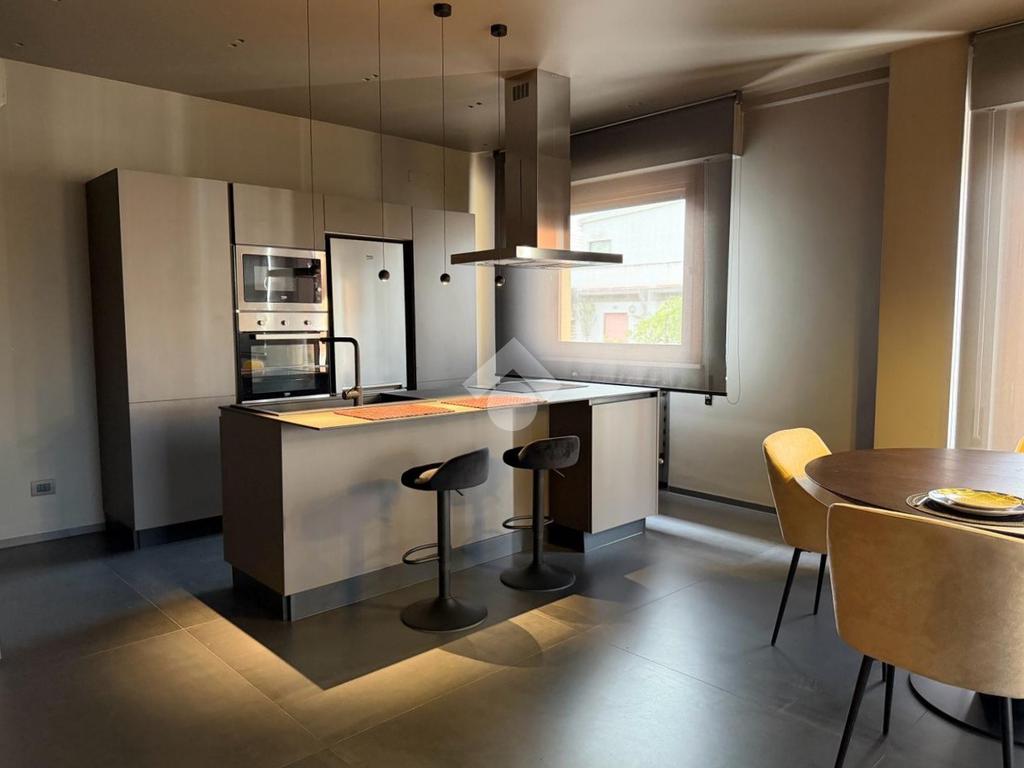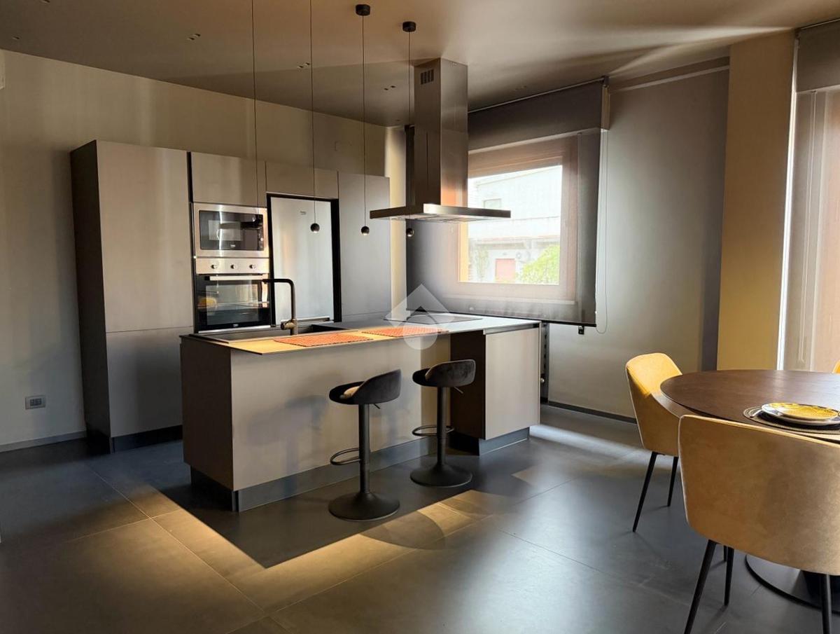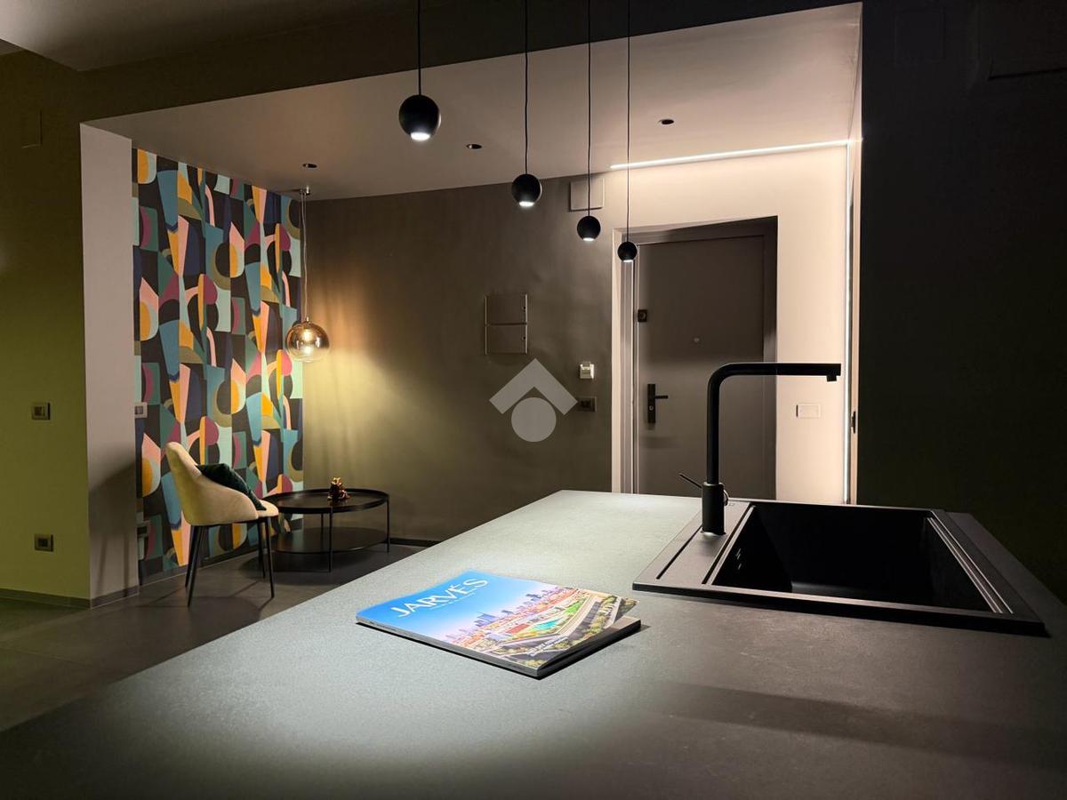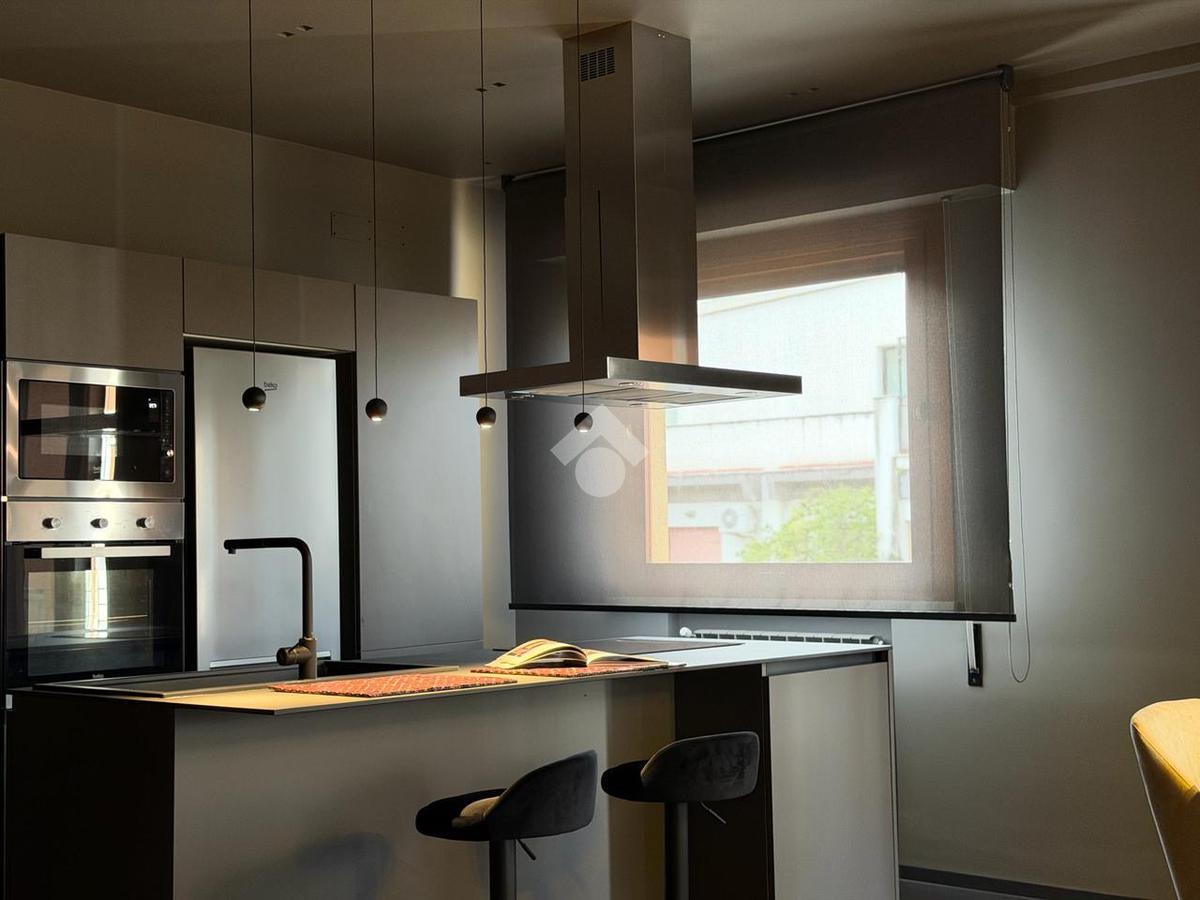 Posto al sesto piano, l’appartamento accoglie con un ampio living di rappresentanza con cucina a vista, dove design contemporaneo e materiali di pregio dialogano in perfetto equilibrio. Le raffinate tonalità del grigio, abbinate a una meticolosa cura dei dettagli e a finiture di alto livello, creano un ambiente elegante e luminoso, valorizzato da ampie superfici finestrate e balconi che offrono una suggestiva vista aperta sul quadrilatero del quartiere.