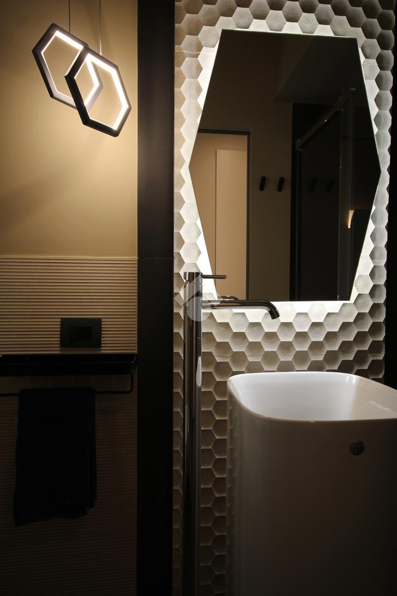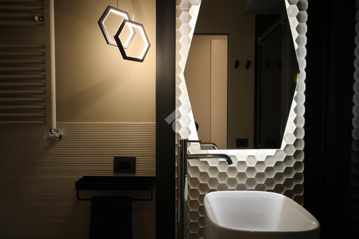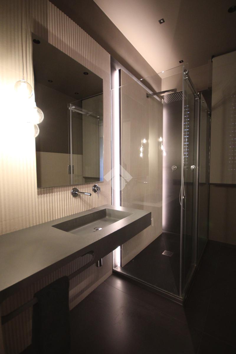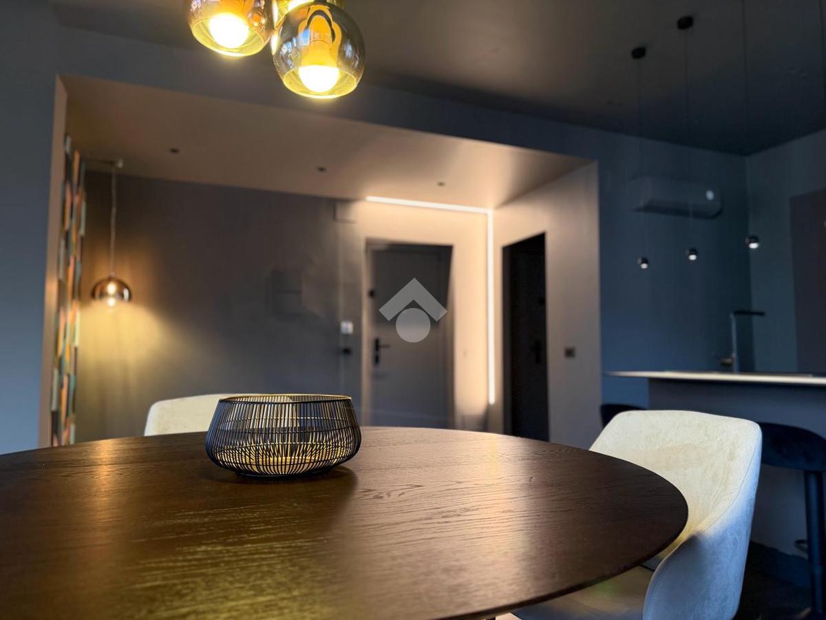 La zona notte, accessibile attraverso un disimpegno con secondo ingresso, ospita due camere da letto dal carattere sofisticato, impreziosite da illuminazione architettonica a LED e rivestimenti decorativi su misura, pensati per garantire comfort e atmosfera.